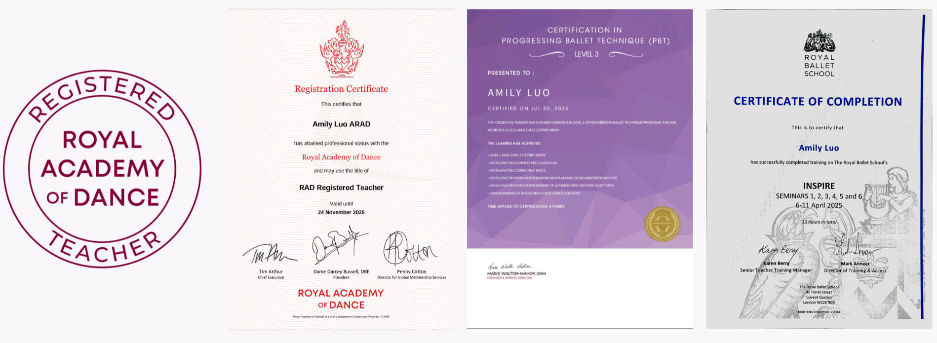 Amily老师自幼在中国学习芭蕾舞。在十岁时从两千余名舞者中脱颖而出,入选由政府全额资助的青少年艺术团(舞蹈一队及民乐团),常年参与各类文艺演出。在伦敦期间,她曾于英国皇家舞蹈学院(RAD)总部进修,并随 PBT 官方导师 Priscilla Law 罗紫玲老师进行线上学习。她在参加英国皇家舞蹈学院(RAD)教师培训的同时,以优异成绩(Distinction)通过 RAD Advanced 2考试。她曾担任中英春节晚会(由中国驻英大使馆主办)开场节目的领舞。她也活跃于时尚圈,作为舞者与模特参与伦敦时装周,PAP杂志、17:23杂志等拍摄,合作方包括 r.l.e.、Pozer、Fuud London、rOtatiOn 回 等。Amily老师教授年龄从 3 岁到 63 岁的学生。这些学生有着不同背景,也包括孕期、SEND与 LGBTQ+学生。她擅长教授各个层级,从零基础到进阶专业训练皆有丰富经验。其中教授 RAD 考级内容的经验从 Pre-Primary 到 Advanced 2,包括男生至 Advanced Foundation的课程。